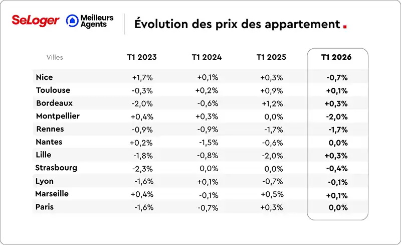 Ailleurs, le décor est moins aimable. Montpellier recule de 2,0 % sur le trimestre. Rennes perd 1,7 %. Nice, longtemps portée par une dynamique solide depuis 2022, cède 0,7 %. Strasbourg baisse de 0,4 %. Marseille ne gagne que 0,1 %. Toulouse avance à peine. Bordeaux limite la casse avec +0,3 %. Dans l’ensemble, ce premier trimestre ne raconte pas une reprise large, homogène, rassurante. Il raconte un marché fragmenté, prudent, parfois encore convalescent, où la moindre hausse ressemble davantage à un rattrapage qu’à une vraie conviction.