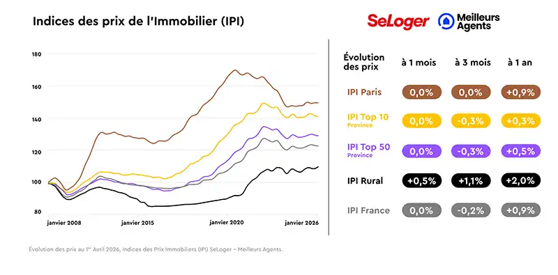 Les prix reculent de 0,2 % en France sur le premier trimestre 2026. Dans le Top 50 des grandes villes, la baisse atteint 0,3 %, tandis que Paris reste stable à 0,0 %. Le marché rural progresse de 1,1 %.