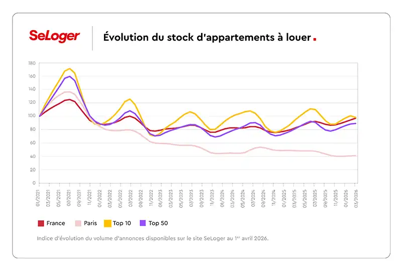 Le chiffre le plus trompeur de ce communiqué est peut-être celui de l’offre. Une hausse de 17 % du stock de biens à louer en un an pourrait donner envie de sortir les confettis réglementaires. Mauvaise idée. Ce rebond intervient après plusieurs années de raréfaction, dans un marché où le stock reste structurellement bas depuis trois ans. SeLoger indique ainsi que le volume de biens disponibles demeure 16 % sous son niveau de 2021.