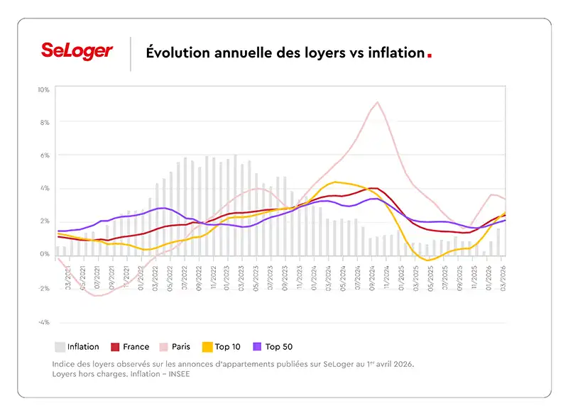 Au 1er avril 2026, les loyers progressent en moyenne de 2,5 % sur un an en France, contre une inflation de 1,9 % en mars 2026. À Paris, la hausse atteint 3,5 % sur un an.